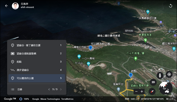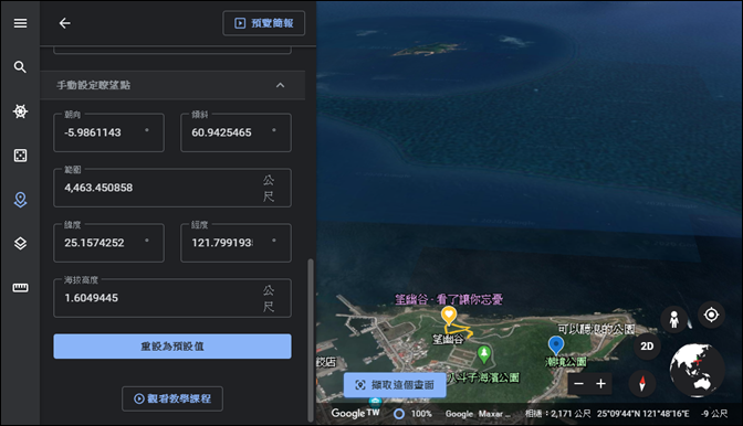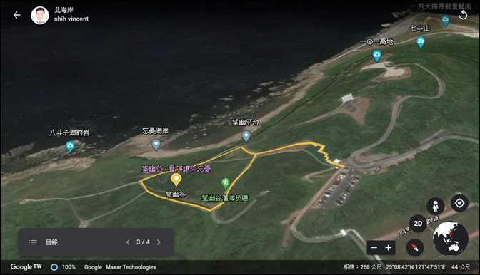 接著,移動地圖上的位置,來到「潮境公園」,切換至 3D 模式,並且調整高度或視角。