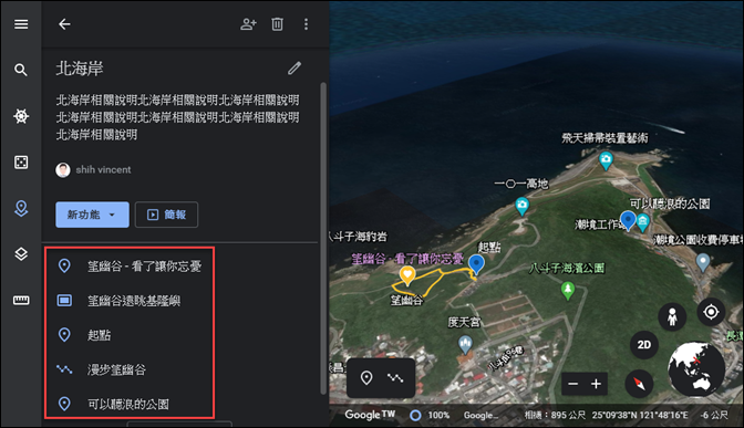 在視窗左側的地點中點選「可以聽浪的公園」:
