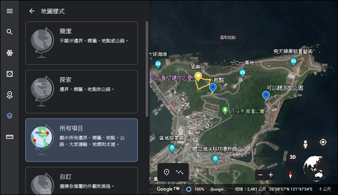 當選取選單中的地圖樣式,你可以使用:簡潔、探索、所有項目、自訂等,來決定地圖上要顯示的內容多寡。(本例選取:所有項目)