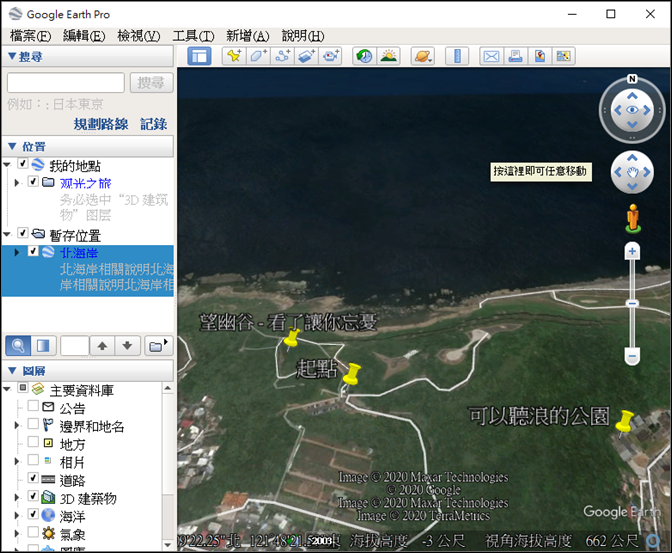 Google 地球隨即移動至該地點,並且顯示該地圖的相關說明(視窗右側)。
