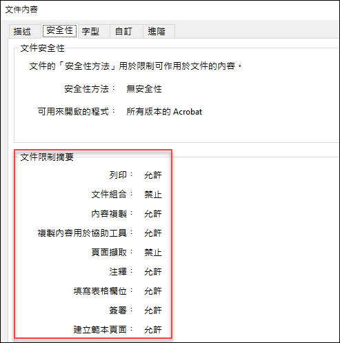 6. 取消列印後,檢視檔案的安全性內容,大多數已經都變成允許了。