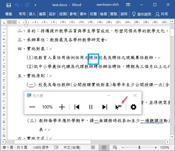 按下「播放」即可對作用中視窗上的文字進行朗讀,唸到地方還會用藍色框框標記。