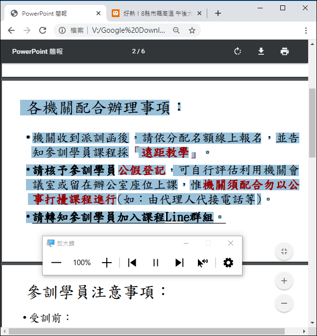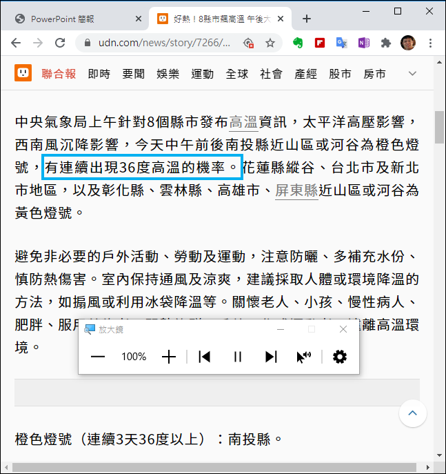 在測試時發現如果以Acrobat Reader開啟PDF檔要執行朗讀,好像會無法成功,不過只要把PDF檔改用瀏覽器開啟,也可以朗讀了。可以選取某些段落字來朗讀。