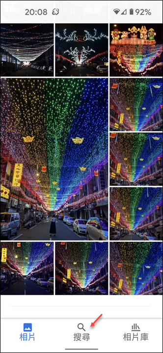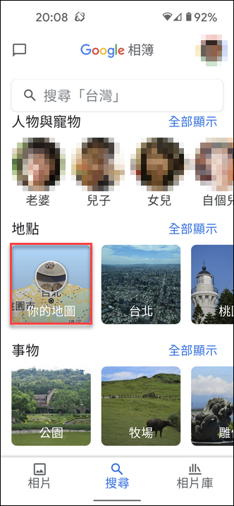 首先,打開 Google 相簿 App ,點選「搜尋」,再點選「你的地圖」。