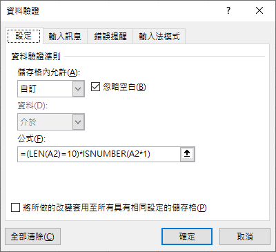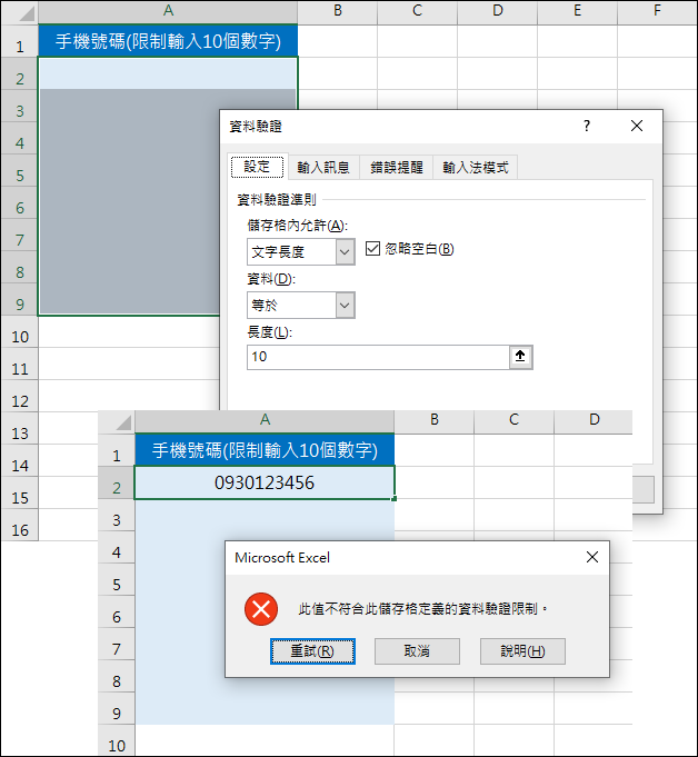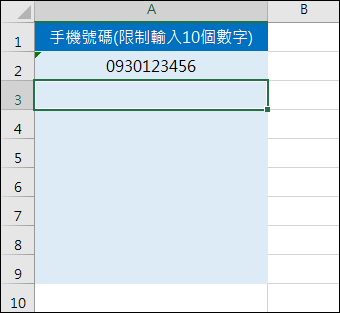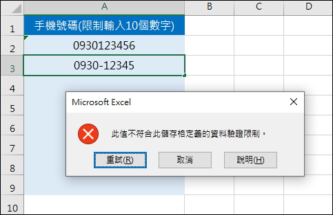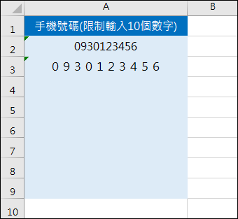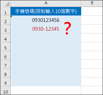 如此,便可以透過資料驗證方式限制必須輸入10位的手機號碼。