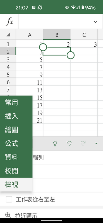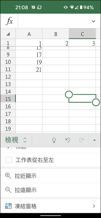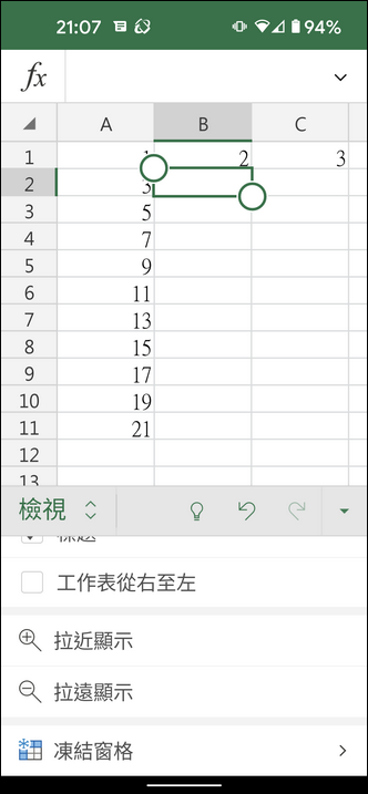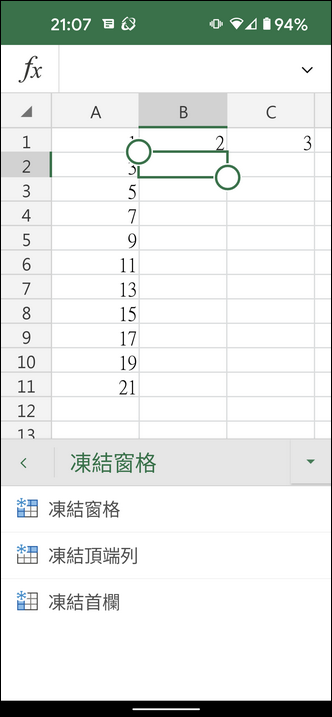 在手機裡執行 Excel,因為螢幕實在太小,要看很多資料時,有時「凍結窗格」實在是需要。該如何操作?