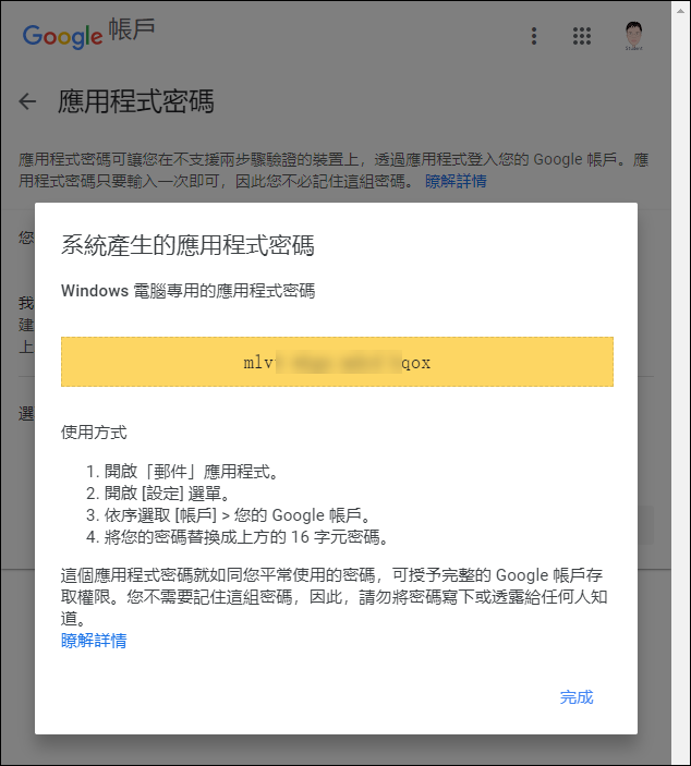 在此會顯示一組「16 字元密碼」,將此密碼複製。