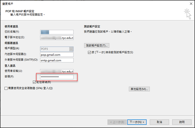 回到 Outlook 裡的帳戶設定,並將此 16 字元密碼,取代你原先的密碼。