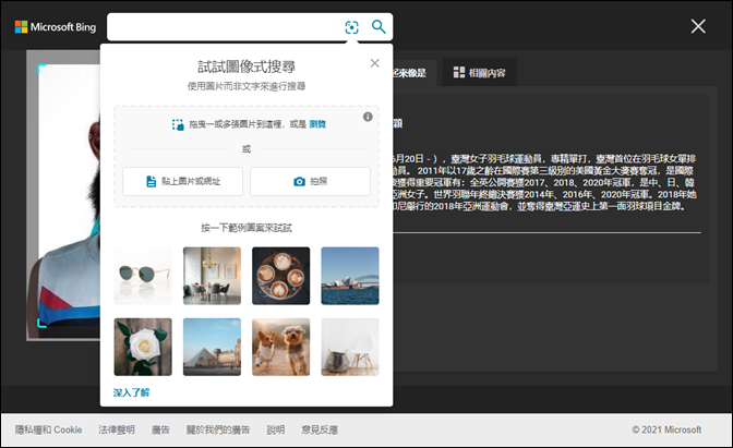 你可以試試 Microsoft Bing 的圖像式搜尋功能。
