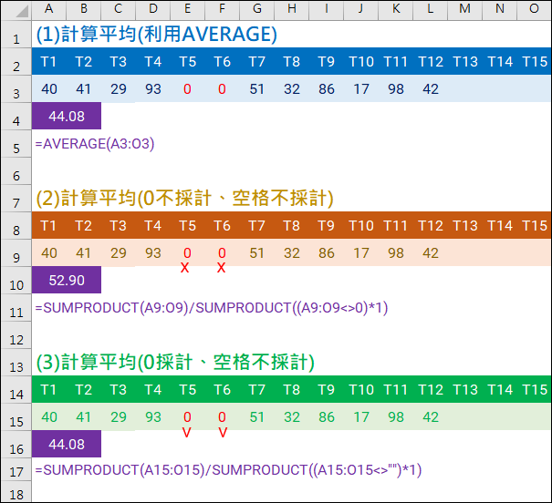 儲存格A10:=SUMPRODUCT(A9:O9)/SUMPRODUCT((A9:O9<>0)*1)