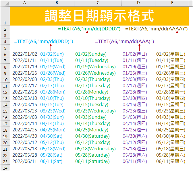 儲存格C6:=TEXT(A6,"mm/dd(DDD)")
