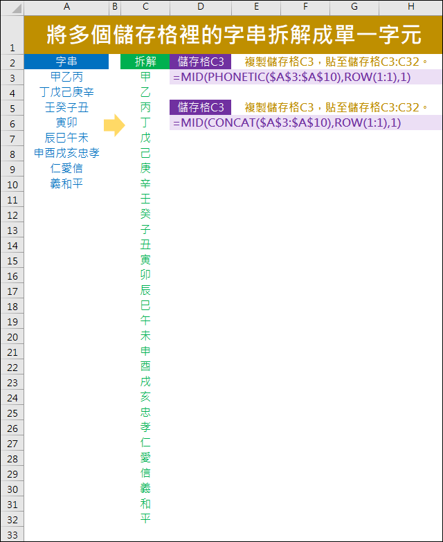 儲存格C3:=MID(CONCAT($A$3:$A$10),ROW(1:1),1)