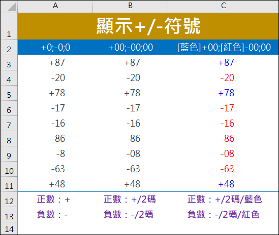2. 正數:+/2碼,負數:-/2碼,數值格式:+00;-00;00