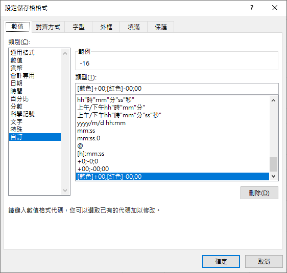 3. 正數:+/2碼/藍色,負數:-/2碼/紅色,數值格式:[藍色]+00;[紅色]-00;00