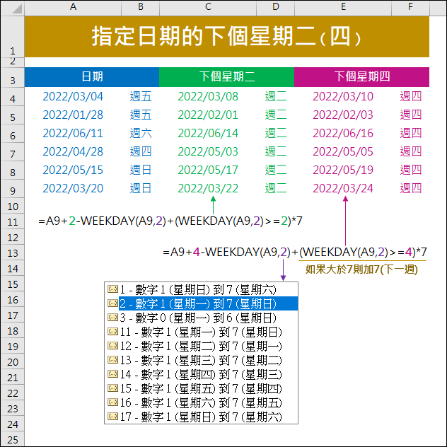 【回答網友提問】如何在 Excel 裡,找出指定日期的下個星期二(或四)?