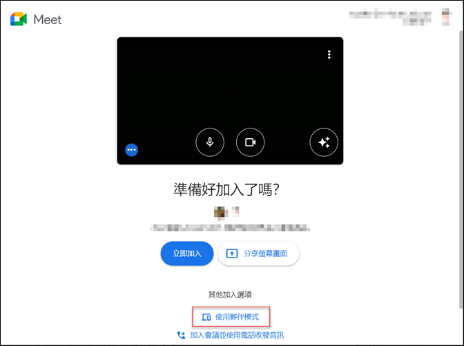 使用Google帳號連線Google Meet會議時,可以選取:使用夥伴模式