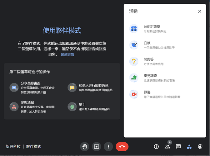 Google Meet 提供了「夥伴模式」,讓你可以在第二台螢幕上利用夥伴模式加入 Google Meet 視訊會議。在夥伴模式中,系統會關閉麥克風和視訊功能,以免造成任何音訊回授。