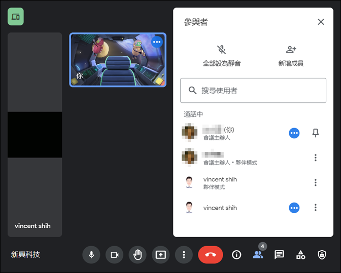 在主辦人的視窗中也可以清楚知道參與者是否以夥伴模式加入。(左上角的綠色圖示和帳號名稱之下也有「夥伴模式」文字)