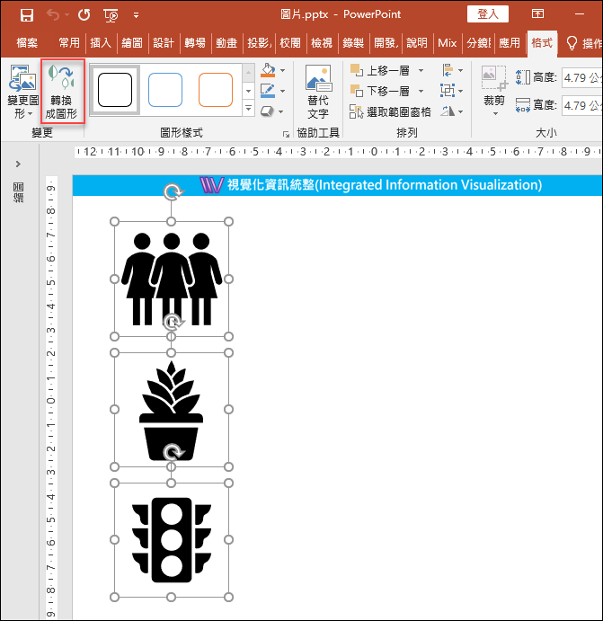 1. 選取圖片後再選「格式/變更」功能表裡的「轉換成圖形」。