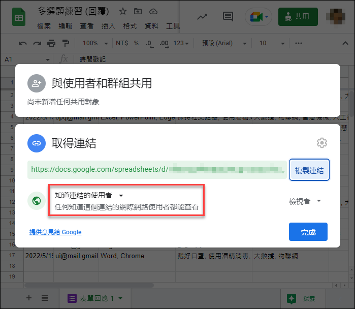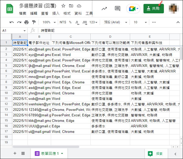 1. 開啟多選題填答結果的Google試算表,並進入「共用」設定。