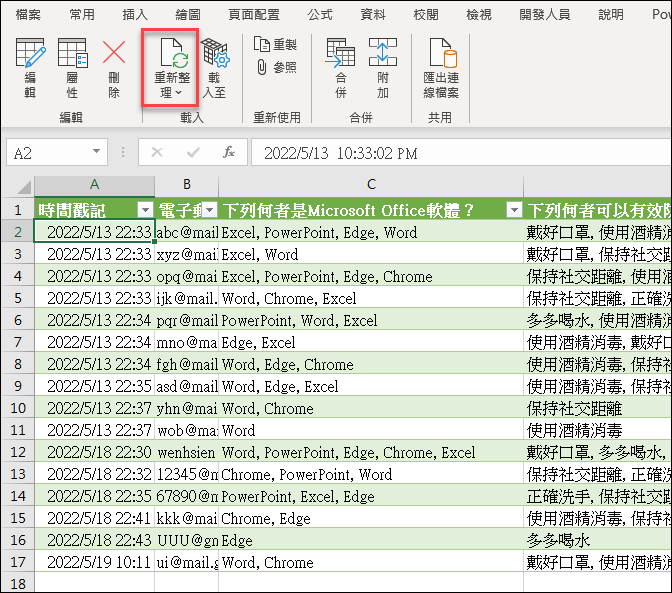 當學生填答完畢後,只要點選「查詢/載入」功能表裡的「重新整理」。新的填答結果會自動帶入。