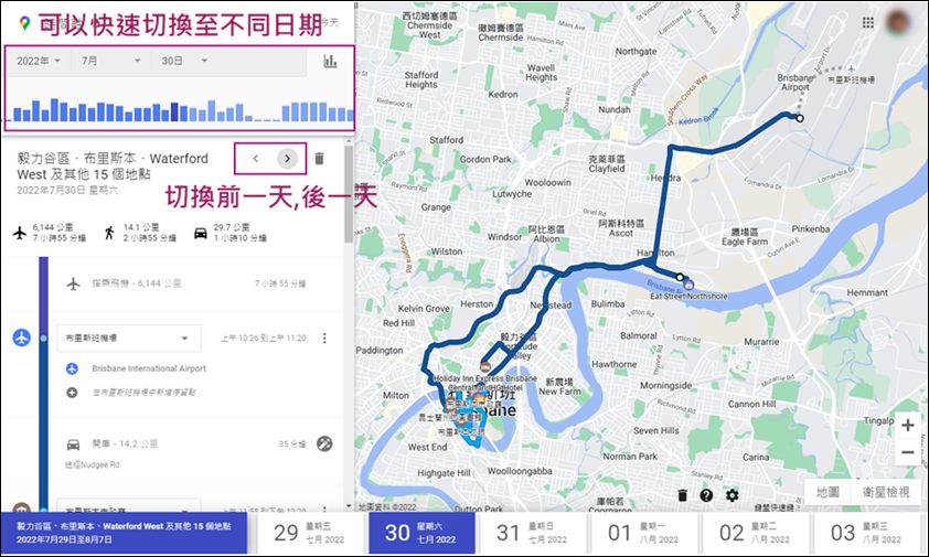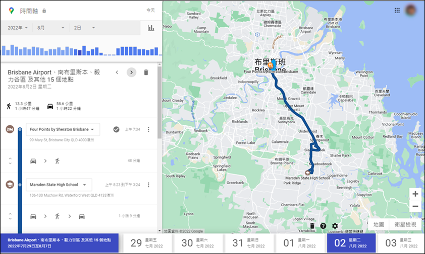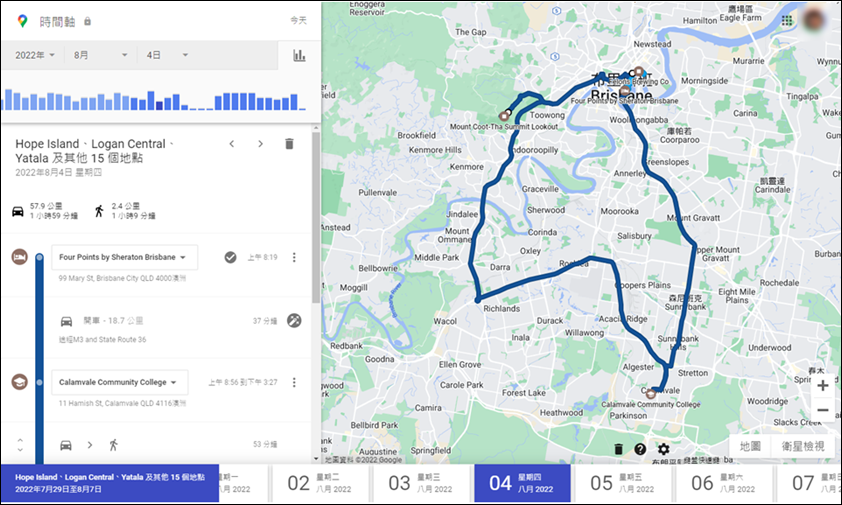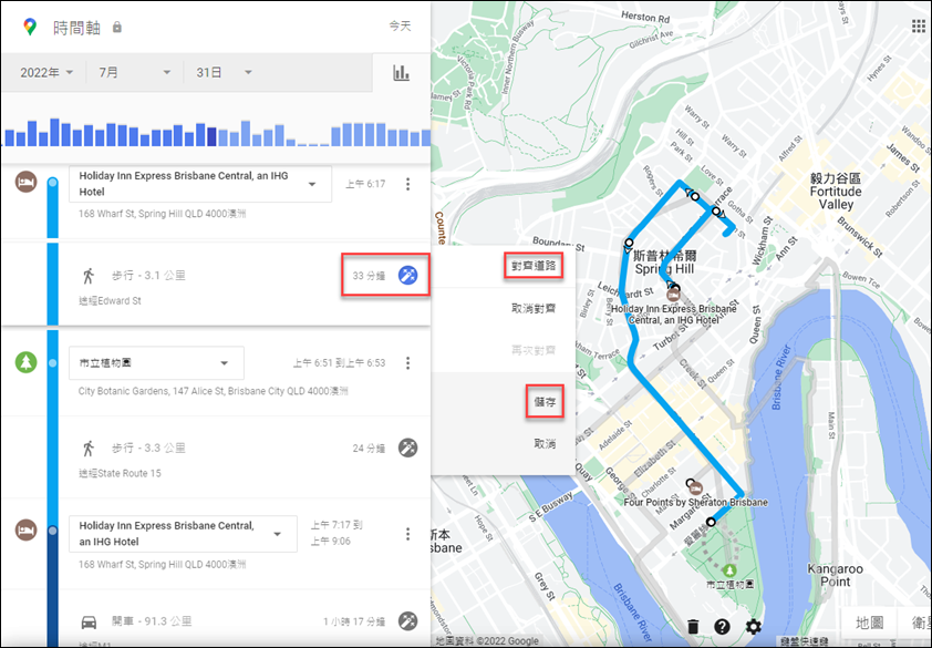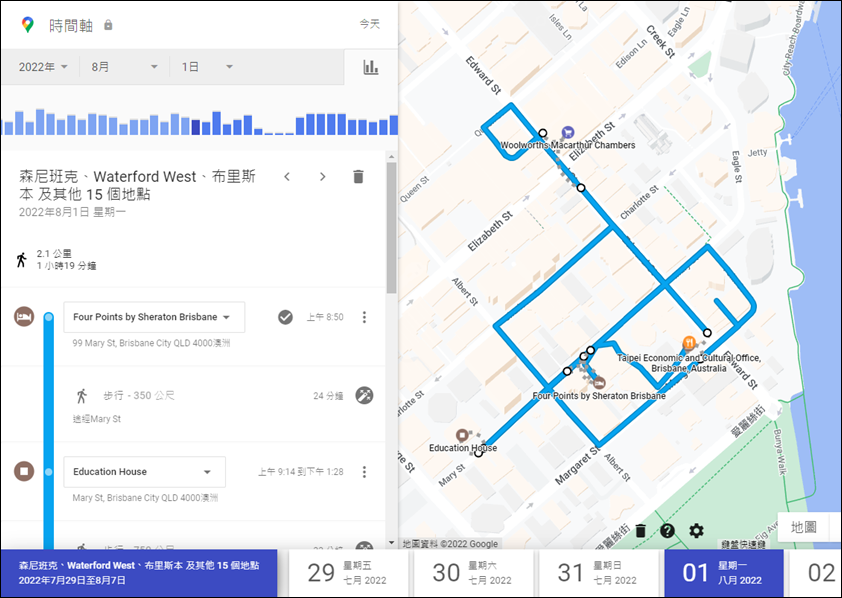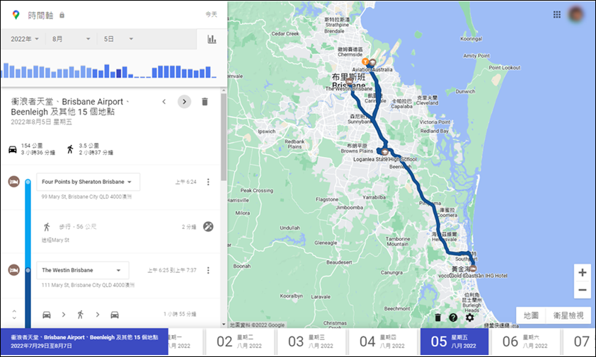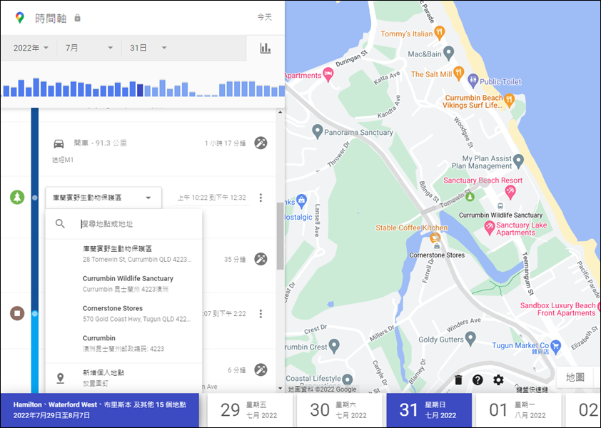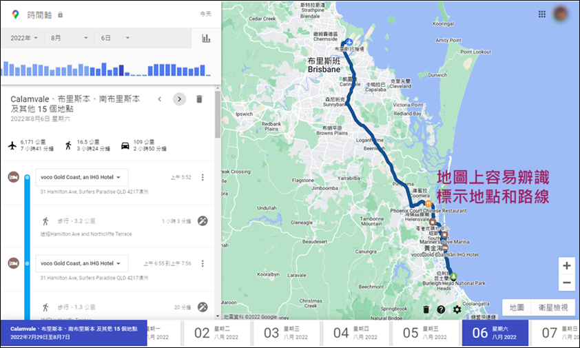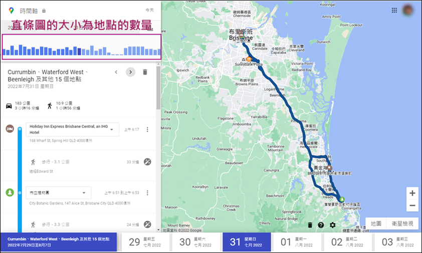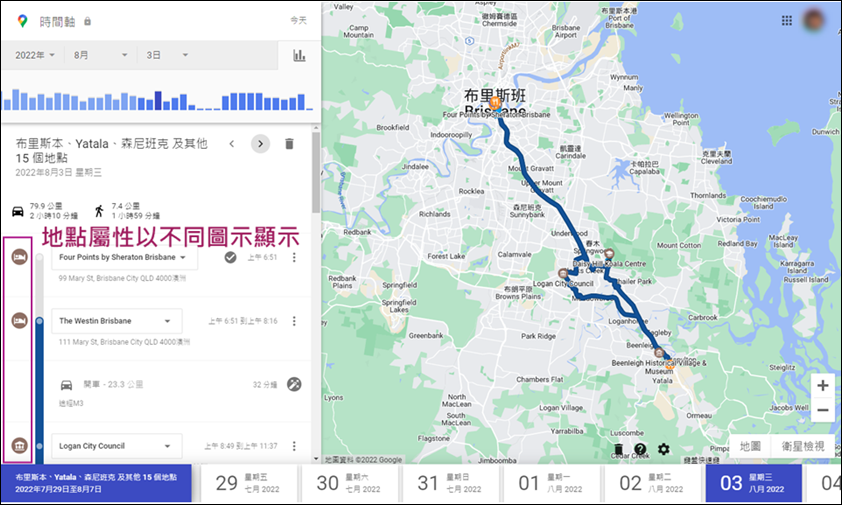 在每一天的時間軸裡,已經有一些地點是 Google 自動判斷加上的停留點,可能會出錯,所以允許你更改。如果有些停留點沒有被 Google 標示出來,則可以自行新增。當然也可以刪除。