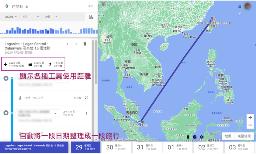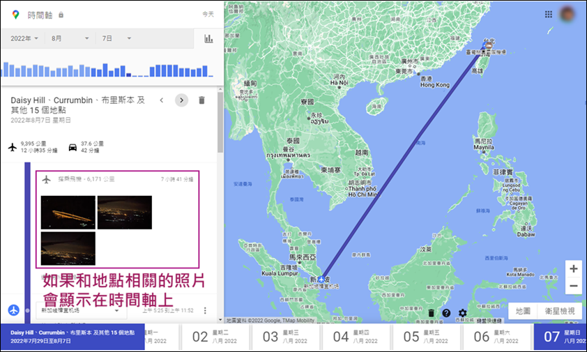 當做了這個動作,不只是可以查閱停留點和行經路徑,它以用來在 Google 相簿中,幫助將沒有 GPS 資訊的照片,配合照片時間,加上接近的 GPS 資訊。