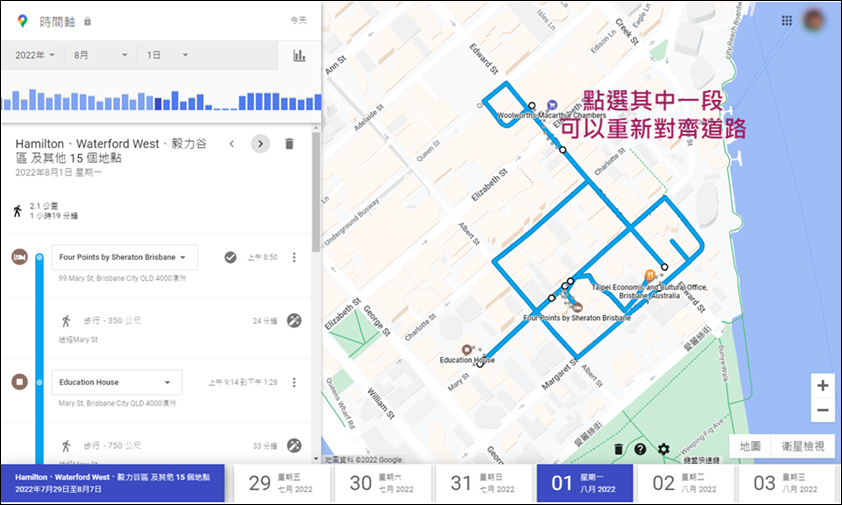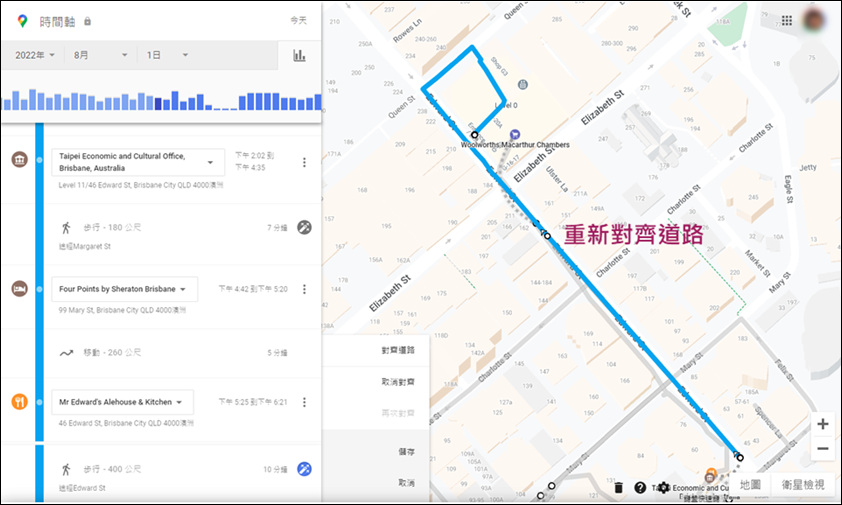 當在時間軸上已有各個停留點資訊,下一步就是利用「對齊道路」功能,將行經路徑精確的顯示出來。如果已經設定對齊道路,則符號會改變。