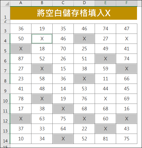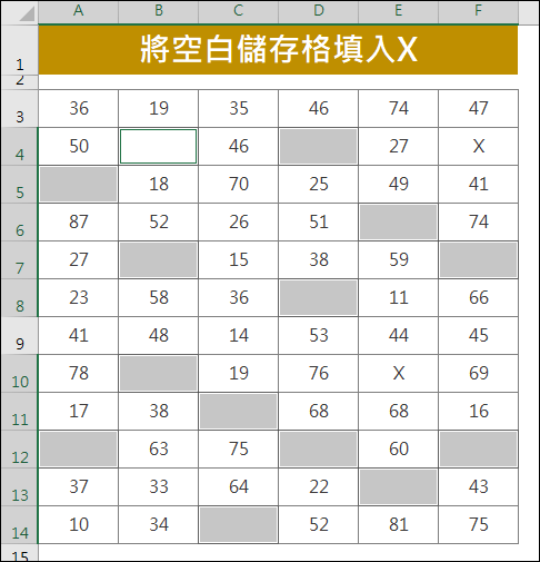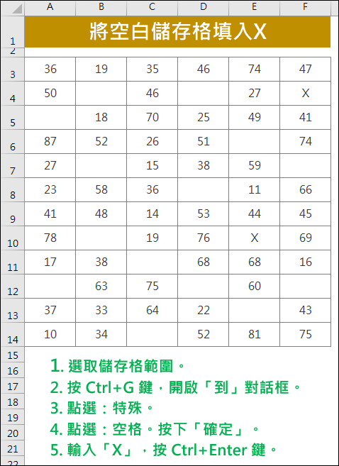 在 Excel 裡,如何在不連續的多個空白儲存格填入「X」字元?