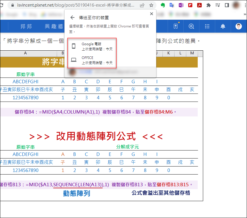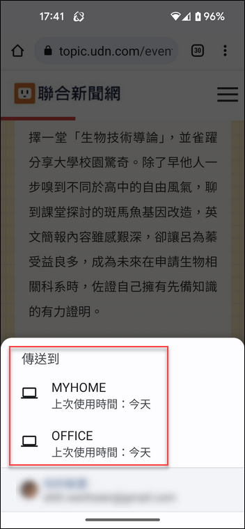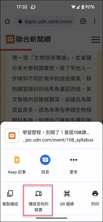 2. 在手機的瀏覽器上選取「傳送至你的裝置」。