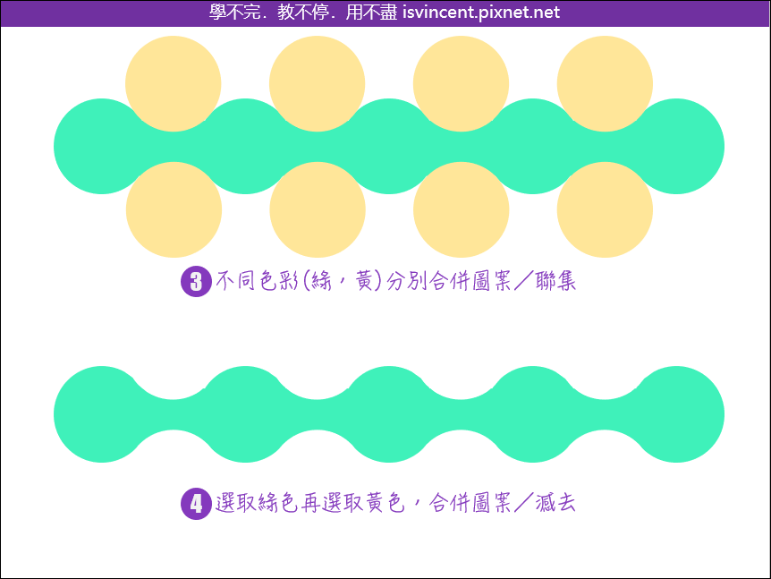 3. 選取所有黃色的圓形,並且執行「合併圖案/聯集」,再選取所有綠色圖案,也執行「合併圖案/聯集」。