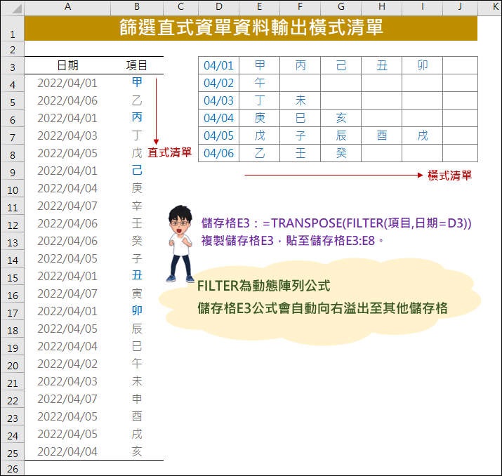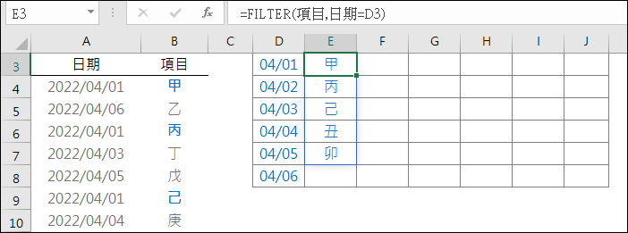 儲存格E3:=TRANSPOSE(FILTER(項目,日期=D3))