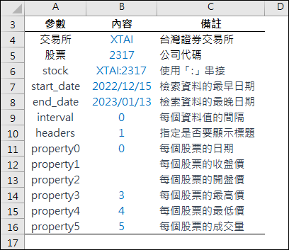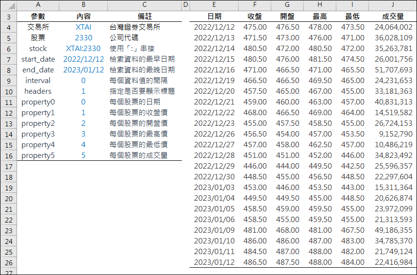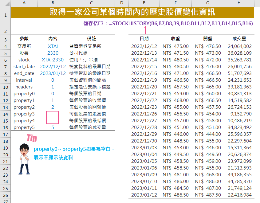 語法:= STOCKHISTORY(stock,start_date,[end_date],[interval],[headers],[property0],[property1],[property2],[property3],[property4],[property5])