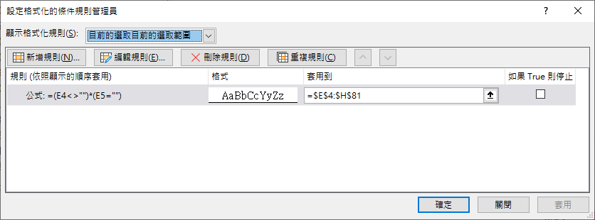 2. 設定格式化的規則:=(E4<>"")*(E5=""),符合者,顯示下框線。