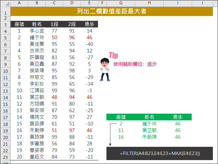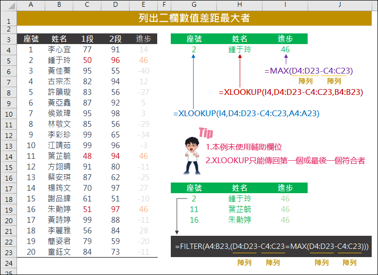 儲存格I4:=FILTER(A4:B23,(D4:D23-C4:C23=MAX(D4:D23-C4:C23)))
