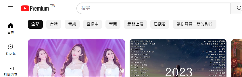 這是 YouTube 首頁中顯示的篩選關鍵字:全部、合輯、音樂、直播中、新聞、最新上傳 已觀看、讓你耳目一新的影片。
