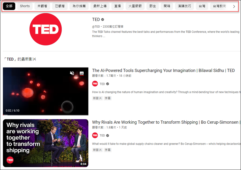 先列出主要分類:「Shorts、未觀看、已觀看、為你推薦、最新上傳、直播」。