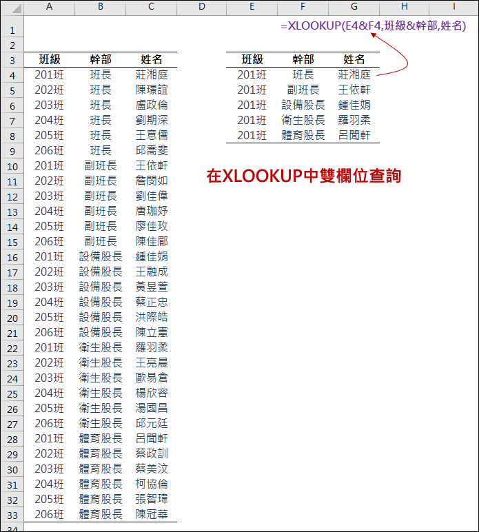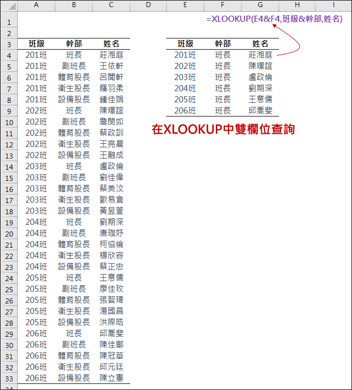 在此使用的技巧是利用「E4&F4」在二個欄位組成的「班級&幹部」中查詢,仍可以查出對應「姓名」欄位內容。這也是 XLOOKUP 函數遠超過 VLOOKUP 函數的地方。