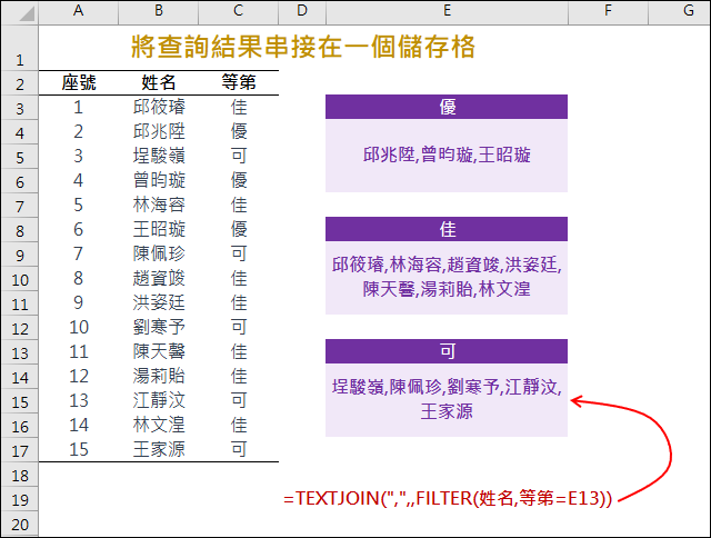 儲存格E14:=TEXTJOIN(",",,FILTER(姓名,等第=E13))