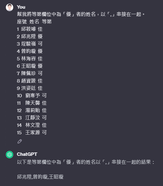 指令:幫我將等第欄位中為「優」者的姓名,以「,」串接在一起。