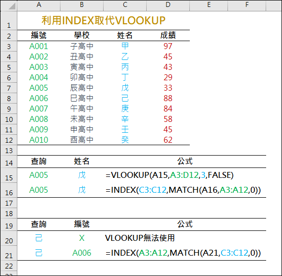 如果以 INDEX 函數搭配 MATCH 函數,則可以由任意欄位查詢另一個欄位的資料。