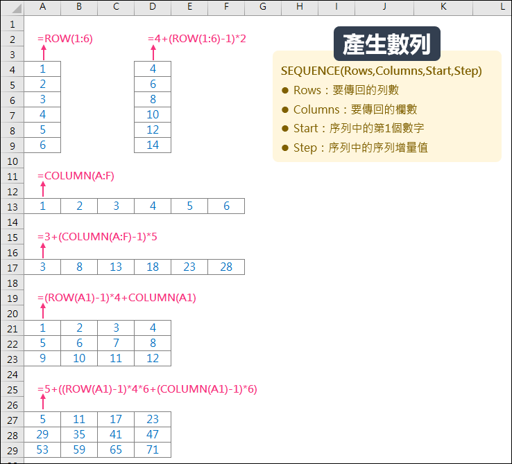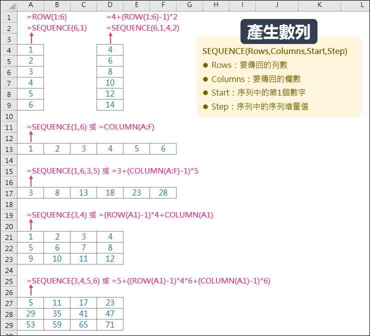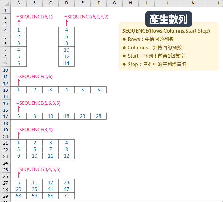 SEQUENCE 函數參考微軟提供的說明:SEQUENCE 函數