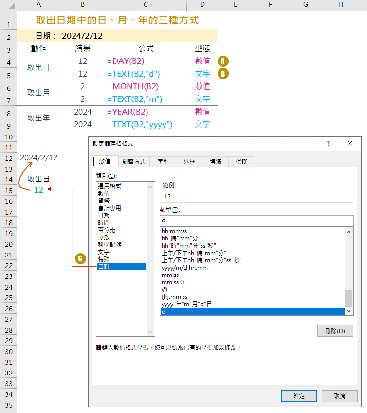 利用 DAY、MONTH、YEAR 函數取出日、月、年,取出的數字為數值。