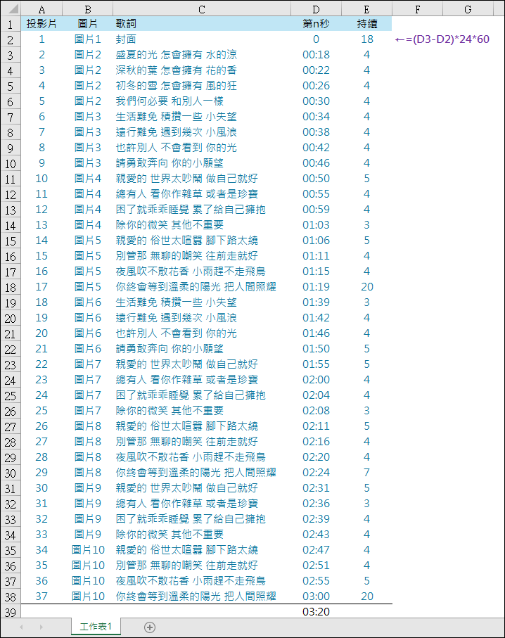 再記錄這首歌的歌詞轉換的時間點(如下圖),再利用公式:=(D3-D2)*24*60,即可算出每張投影片要停留的秒數。