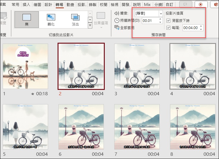 接著,設定每張投影片的持續時間(0.01秒),再將投影片換頁每隔的秒數設定成Excel的表格裡的數值: