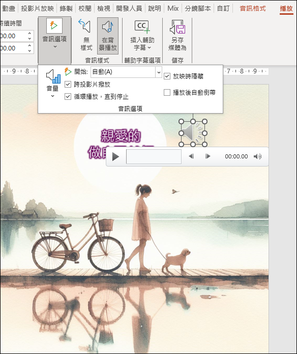 將音樂MP3插入第一張投影片,並設定自動播放及跨投影片播放: