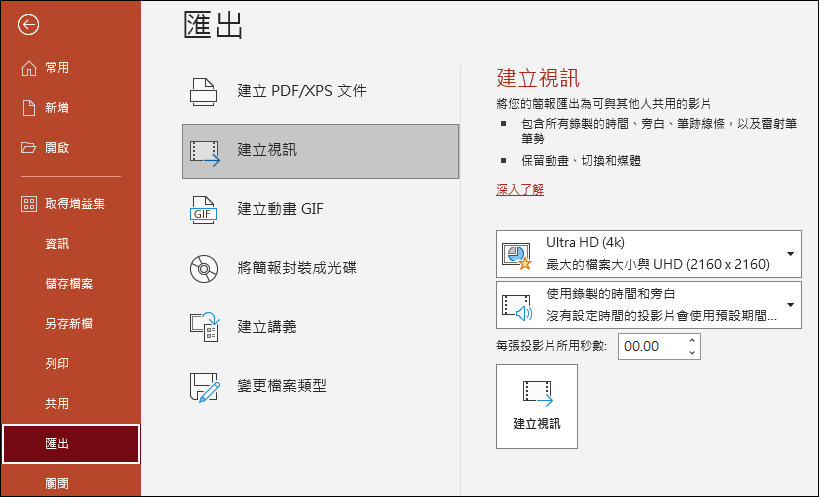最後,匯出視訊成為影片:(選取影片解析度並將每張投影片所有秒數設定為 0)