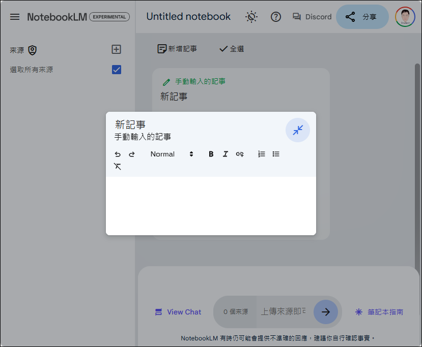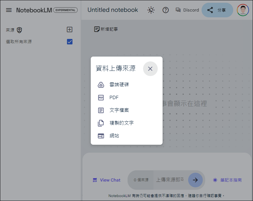 NotebookLM 允許你上傳資料,可以點選:雲端硬碟、PDF、文字檔案、複製的文字、網站等,也就是在記事中可以插入資料來源。
