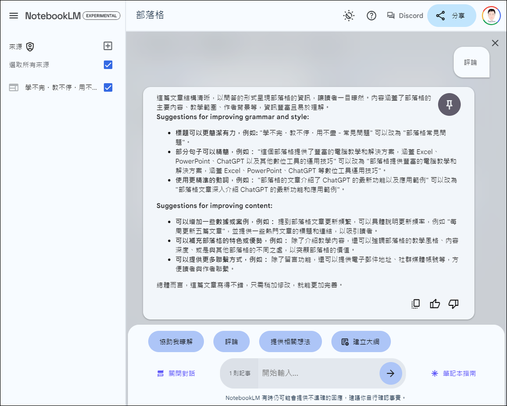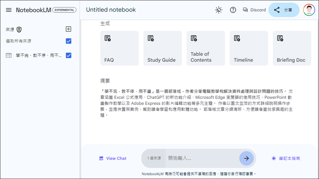 當我點選:網站,並且輸入「https://isvincent.pixnet.net」,當你資料夾源,NotebookLM立即生成一份摘要文字。