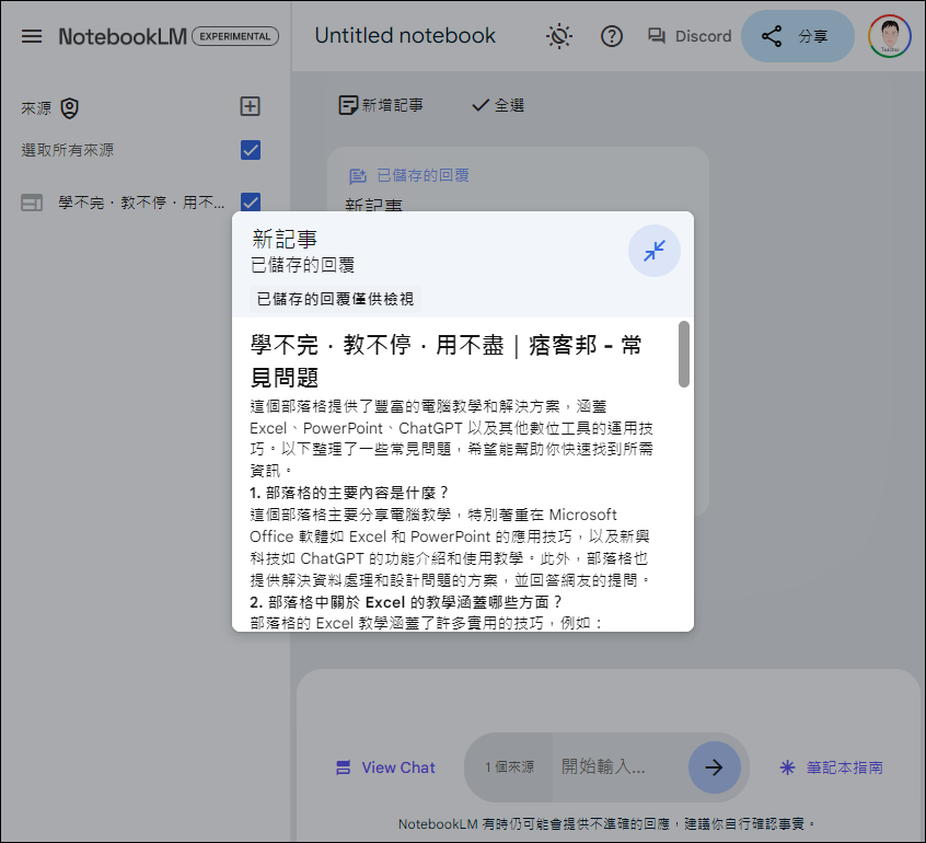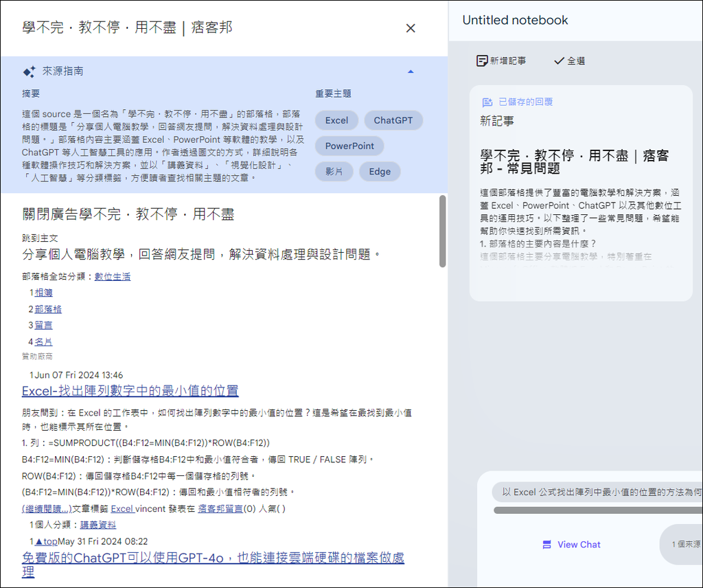 點選視窗左側的筆記,則會展開抓到的內容。在此還顯示了來源指南:摘要、重要主題。